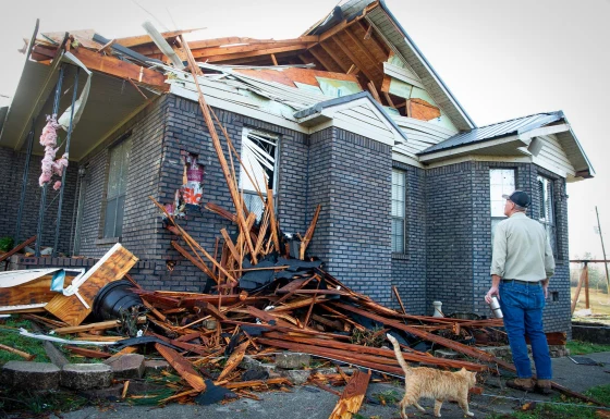 Kerry Walker checks damage to his home near Plantersville, Ala., on Sunday