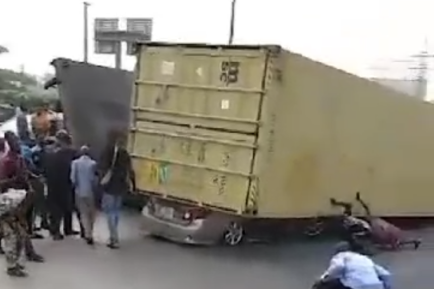 A 40-feet container-laden truck has fallen on a car at the Mile 2 area of Lagos state.