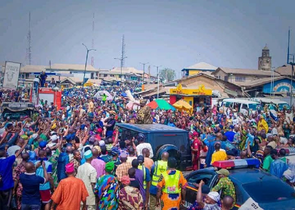 The people of Oyo Town were in jubilant mood on Monday as they warmly welcomed the new Alaafin, Oba Abimbola Owoade to the ancient city for the first time, following the presentation of instruments of office to him by Governor Seyi Makinde.