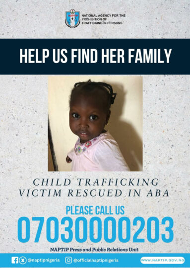 The National Agency for the Prohibition of Trafficking in Persons (NAPTIP) is seeking the biological parents or family of a two-year-old girl it rescued from kidnappers.