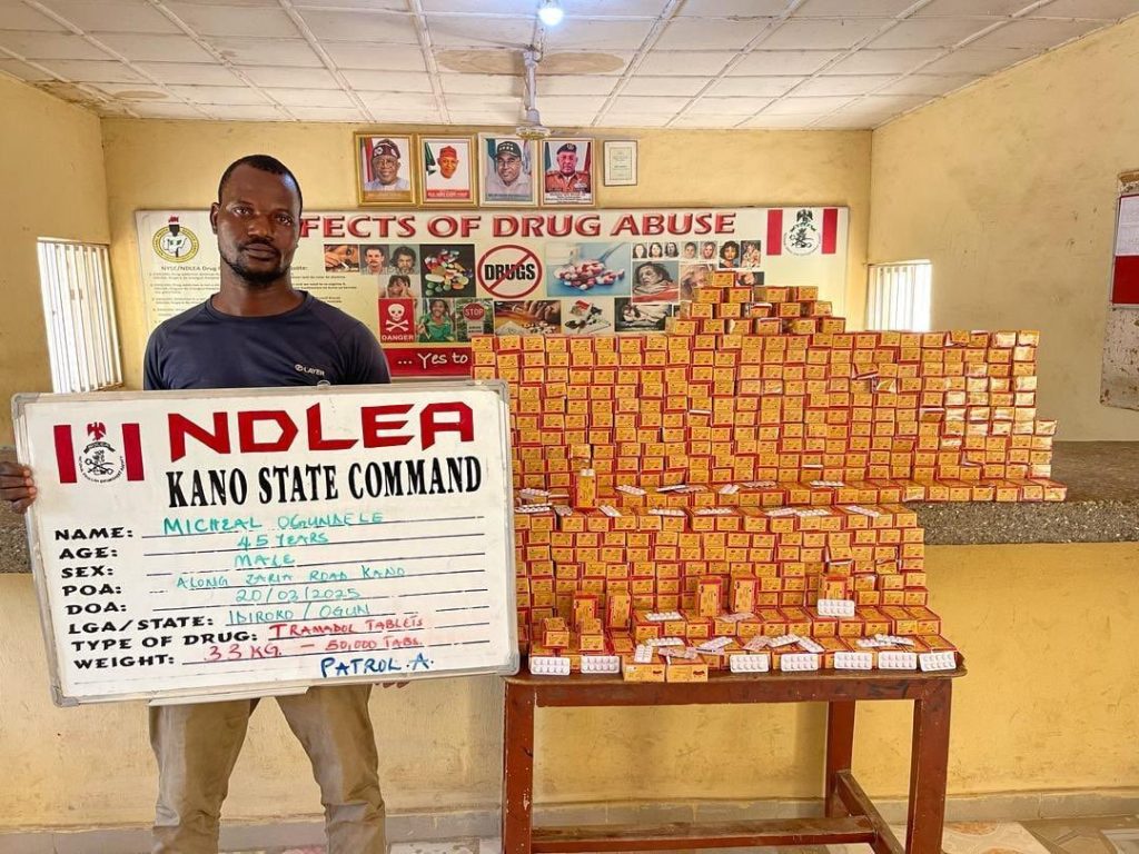 NDLEA officers in Kano also seized 50,000 tramadol pills concealed in a 50-litre steel gas cylinder from Michael Ogundele, a 45-year-old suspect.